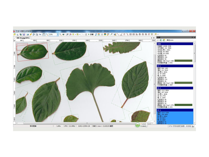 3、可大批量全自动分析多片叶叶面积、周长、*大叶长、*大叶宽、矩形度、凹凸比、球状性、形状系数和虫洞数量,并标记叶片边缘以便核对正确。